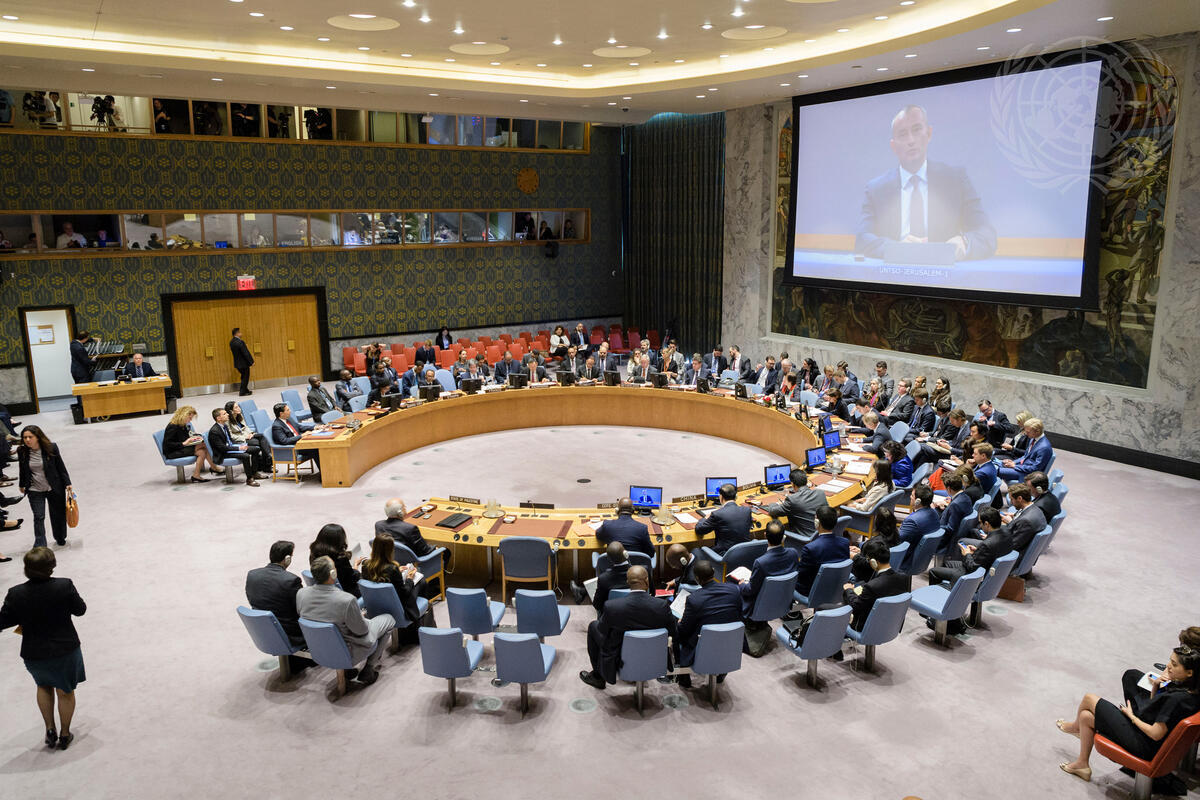 Nickolay Mladenov (on screen), UN Special Coordinator for the Middle East Peace Process and Personal Representative of the Secretary-General to the Palestine Liberation Organization and the Palestinian Authority, briefs the Security Council on the situation in the Middle East, including the Palestinian question.