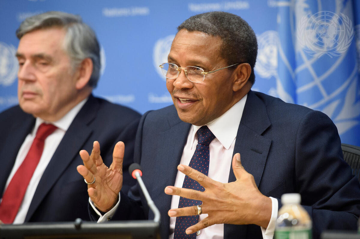 Jakaya Kikwete (right), former President of Tanzania and Commissioner with the International Commission on Financing Global Education Opportunity, briefs journalists on the launch of International Finance Facility for Education as a guest at the noon briefing. At left is Gordon Brown, United Nations Special Envoy for Global Education and Chair of the International Commission on Financing Global Education Opportunity.