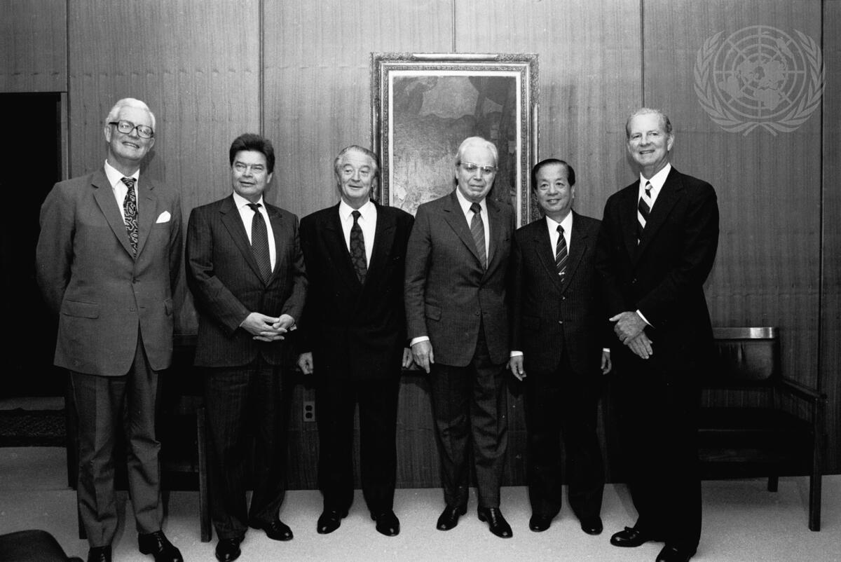 Photo shows Javier Perez de Cuellar, Secretary-General of the United Nations, as he hosts a luncheon for the Ministers for Foreign Affairs of the five permanent members of the Security Council.
