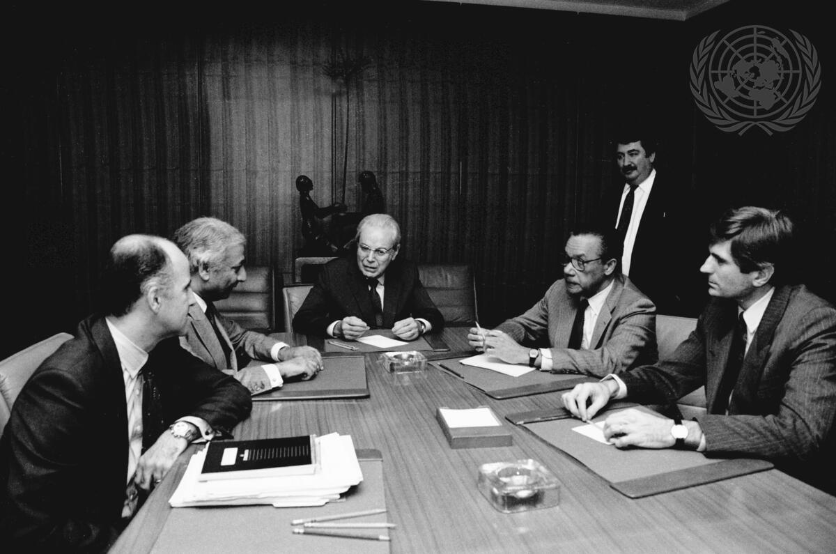 From left to right are: Alvaro de Soto, ASG, his Personal Representative for Central America, and USG Virendra Dayal, Chef de Cabinet. On the right: ASG Giandomenico Picco (foreground), Assistant for Special Assignments, and ASG Jean-Claude Aime, Executive Assistant to the Secretary-General. Top right (standing) is Francois Giuliani, Spokesman for the Secretary-General."