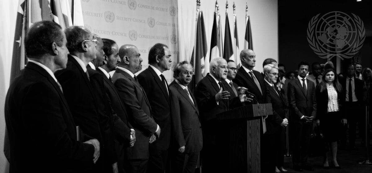 Riyad H. Mansour (at podium), Permanent Observer of the State of Palestine to the UN, speaks to journalists following the Security Council meeting on the situation in the Middle East, including the Palestinian question. On his sides are Members of the Security Council and Representatives of Arab States.