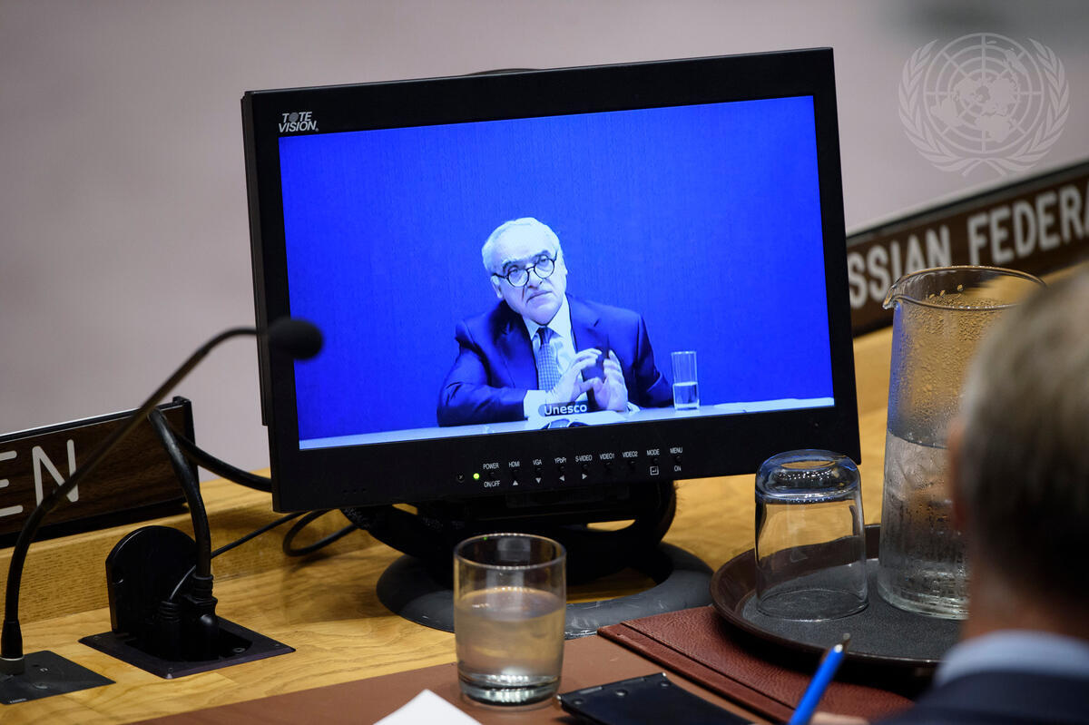 Ghassan Salamé (on screen), Special Representative of the Secretary-General and Head of the United Nations Support Mission in Libya (UNSMIL), addresses the Security Council meeting on the situation in Libya.