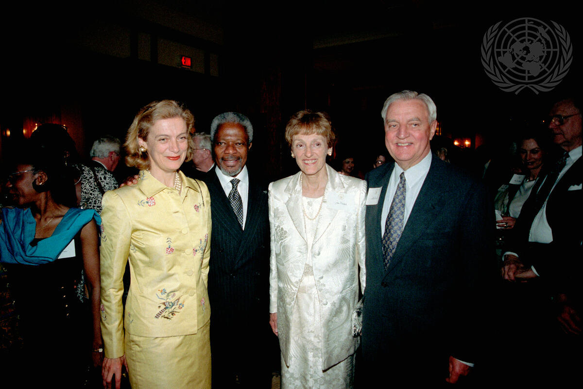 Photo shows Kofi Annan, Secretary-General of the United Nations, and spouse Nane Annan, with Walter Mondale, former Vice-President of the United States of America, and spouse Joan Modale, at a dinner hosted by the President and Board of Trustees of Macalester College.