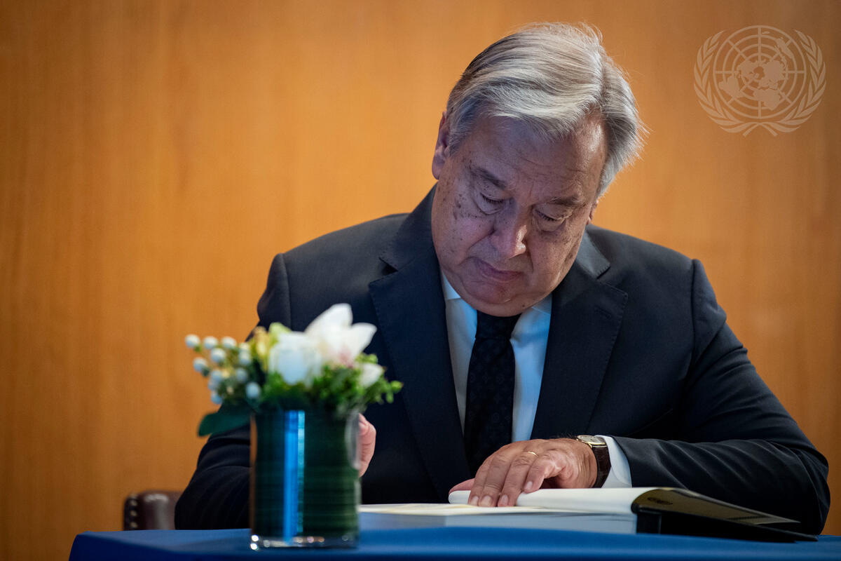Secretary-General António Guterres signs a book of condolences during a ceremony honouring the memory and legacy of former Secretary-General Kofi Annan, who passed away on 18 August at the age of 80. Mr. Annan was the seventh Secretary-General of the United Nations, serving from 1997 to 2006.