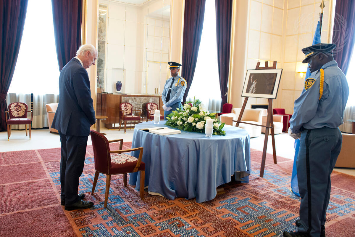 Staffan de Mistura, UN Special Envoy for Syria, bows his head before signing a book of condolences to honour the memory and legacy of former Secretary-General Kofi Annan, who passed away on 18 August. Mr. Annan was the seventh Secretary-General of the United Nations, serving from 1997 to 2006.