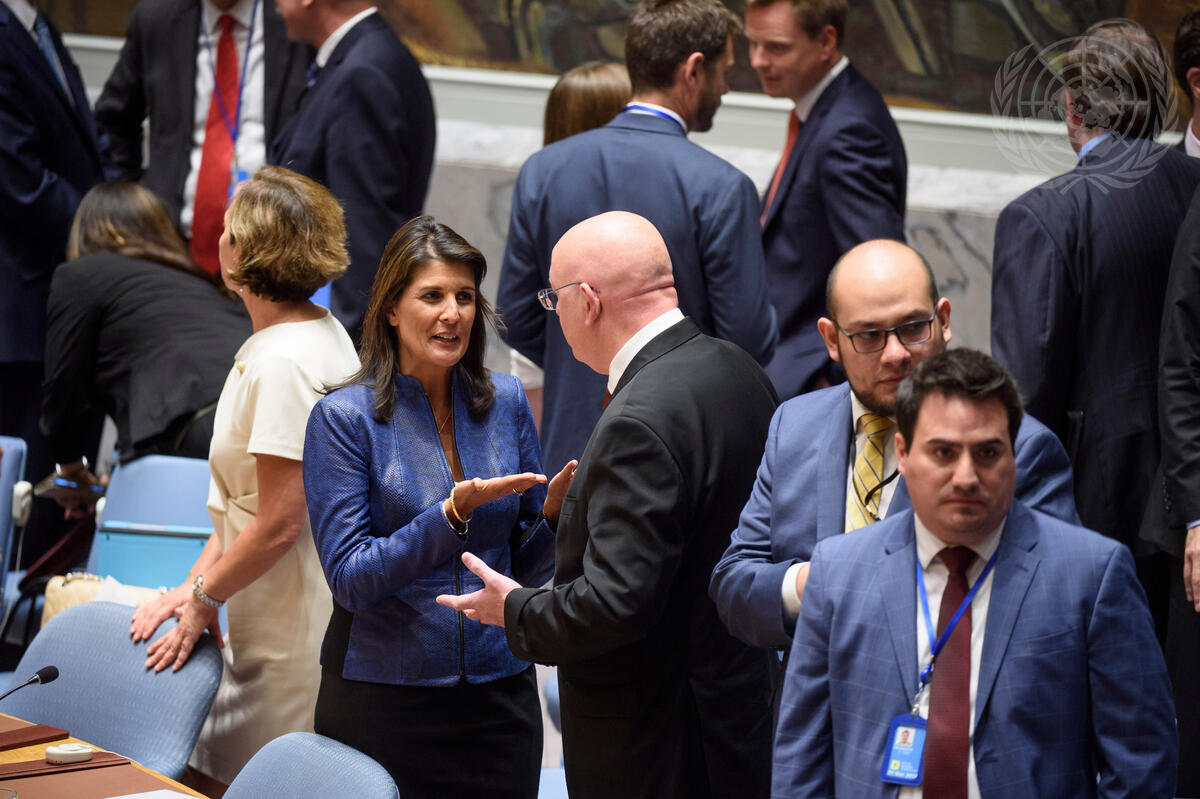 Nikki R. Haley (centre left), Permanent Representative of the United States to the UN, speaks with Vassily Nebenzia (centre), Permanent Representative of the Russian Federation, prior to the Security Council meeting on threats to international peace and security caused by terrorist acts.