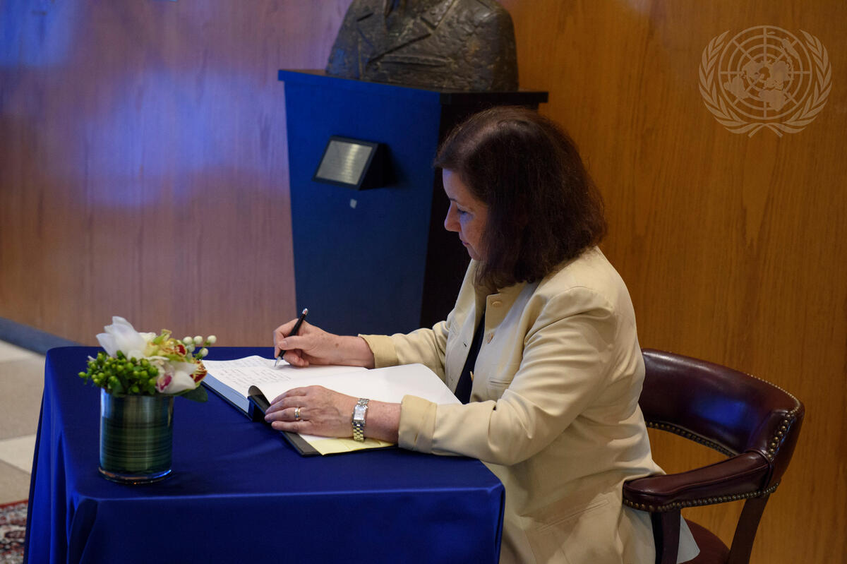Maria Luiza Ribeiro Viotti, Chef de Cabinet to Secretary-General António Guterres, signs a book of condolences for former Secretary-General Kofi Annan, who died on 18 August at the age of 80. The seventh Secretary-General of the United Nations, Mr. Annan served from 1997 to 2006.
