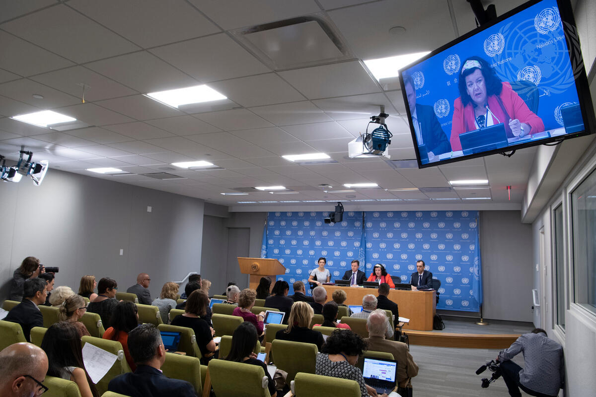 Karen Pierce (on screen and second from right at dais), Permanent Representative of the United Kingdom and President of the Security Council for the month of August, briefs journalists on the Council’s programme of work for the month.
