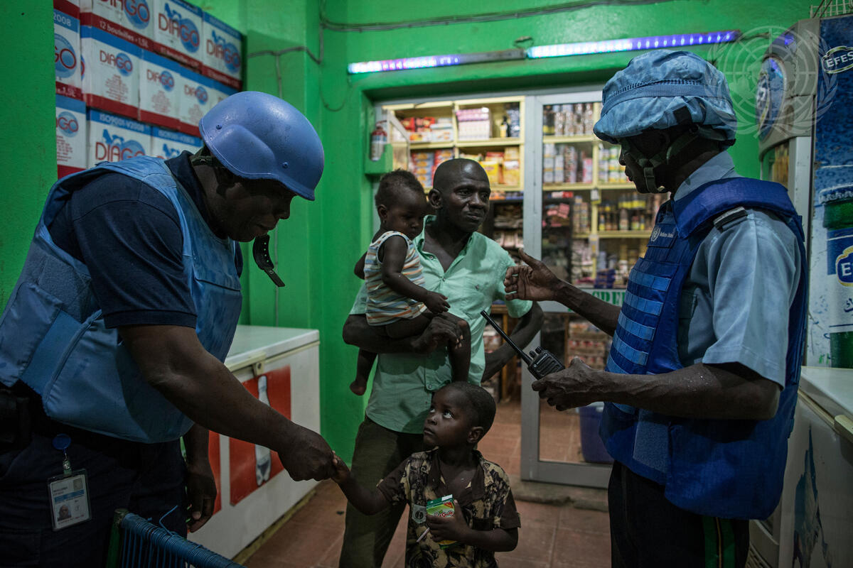 UN Police (UNPOL) Officers serving with the United Nations Multidimensional Integrated Stabilization Mission in Mali (MINUSMA) speak with a Malian during a night patrol on election day in Gao.