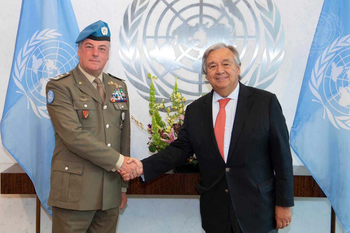 Secretary-General António Guterres (right) meets with Major-General Stefano Del Col, Head of Mission and Force Commander of the United Nations Interim Force in Lebanon (UNIFIL).