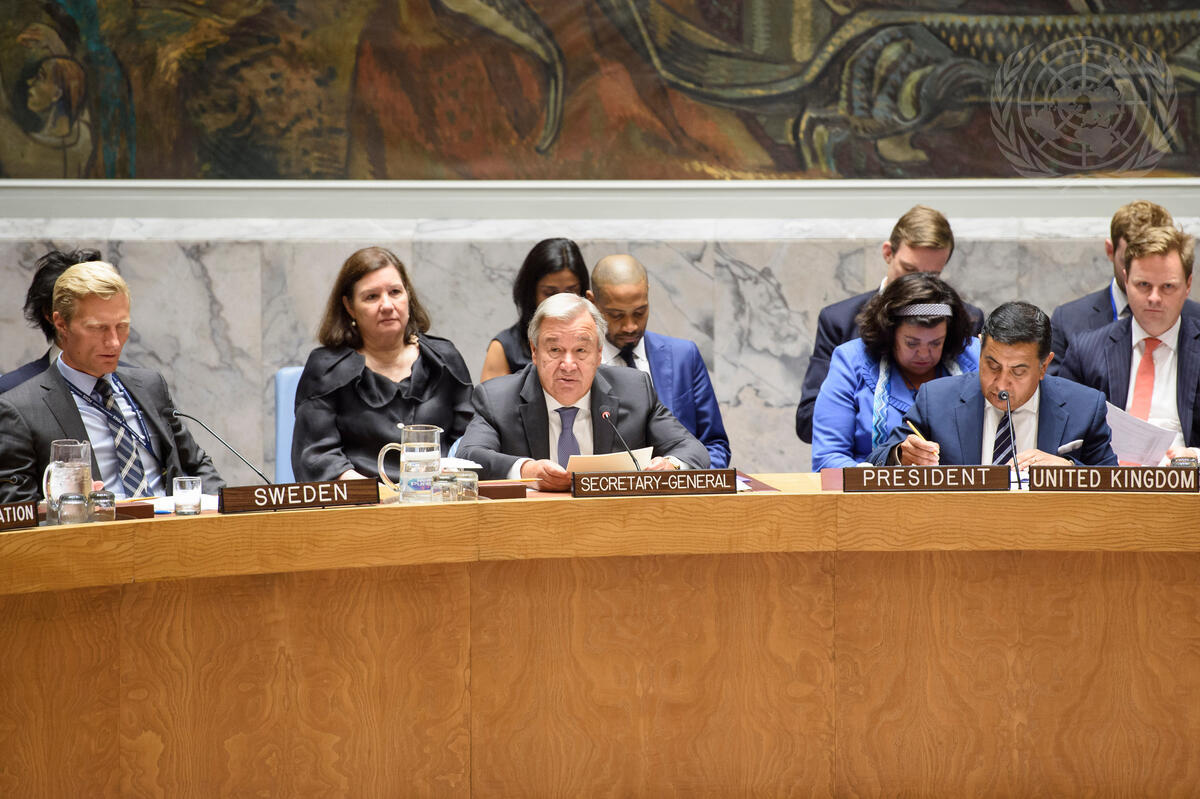 Secretary-General António Guterres (centre) addresses the Security Council meeting on the maintenance of international peace and security, with a focus on mediation and settlement of disputes. To his left is Tariq Mahmood Ahmad of Wimbledon, Minister of State for the Commonwealth and the United Nations of the United Kingdom and President of the Security Council for the month of August, and to his right is Carl Skau, Security Council Coordinator of Sweden to the UN.