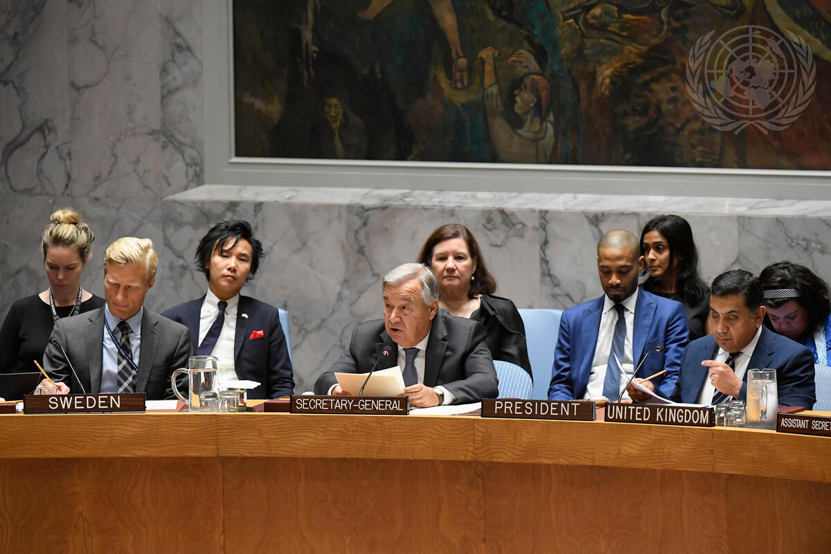 Secretary-General António Guterres (centre) addresses the Security Council meeting on the maintenance of international peace and security, with a focus on mediation and settlement of disputes. To his left is Tariq Mahmood Ahmad of Wimbledon, Minister of State for the Commonwealth and the United Nations of the United Kingdom and President of the Security Council for the month of August, and to his right is Carl Skau, Security Council Coordinator of Sweden to the UN.