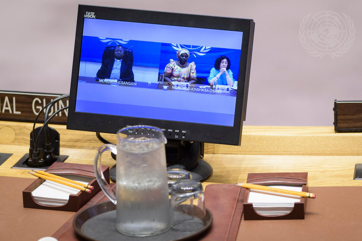 View of a screen in the Security Council chamber as participants joining via video-link brief the Council on the situation concerning the Democratic Republic of the Congo. Pictured on screen (left to right): Marcel Utembi, President of the National Episcopal Conference of the Congo (CENCO); Solange Lwashiga Furaha, Spokesperson for Rien Sans Les Femmes; and Leila Zerrougui, Special Representative and Head of the United Nations Stabilization Mission in the Democratic Republic of the Congo (MONUSCO).