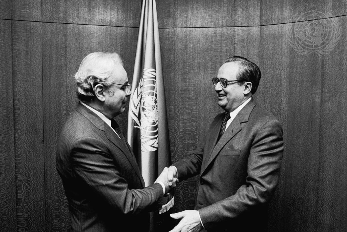 Javier Perez de Cuellar, Secretary-General of the United Nations, in a meeting with Judge Jose Maria Ruda, President of the International Court of Justice, at United Nations.