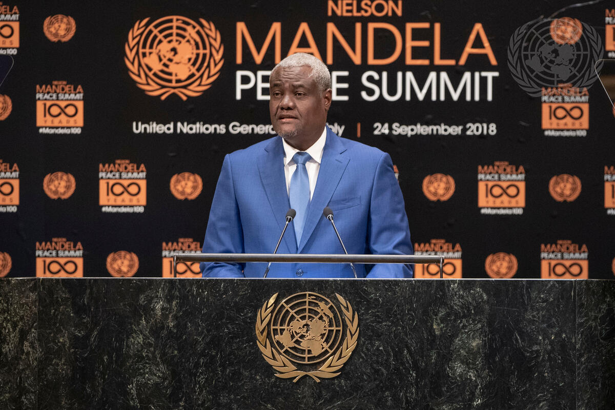Moussa Faki, Chairperson of the African Union, makes remarks during the Nelson Mandela Peace Summit.