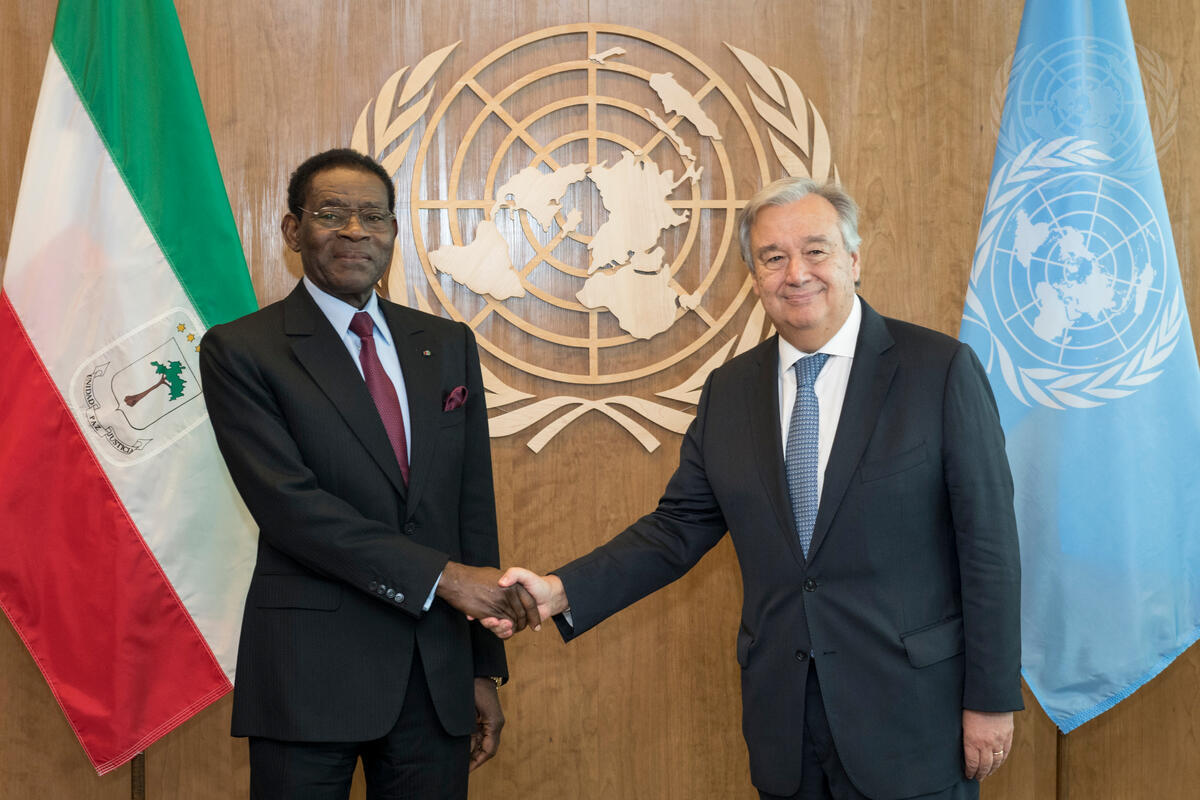 Secretary-General António Guterres (right) meets with Teodoro Obiang Nguema Mbasogo, President of the Republic of Equatorial Guinea.
