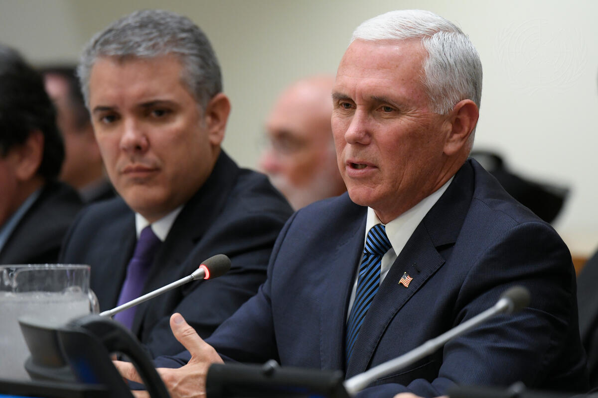 Michael R. Pence, Vice President of United States of America, addresses a meeting on regional migration organized by the Permanent Mission of Colombia to the UN. At left is Iván Duque Márquez, President of the Republic of Colombia.