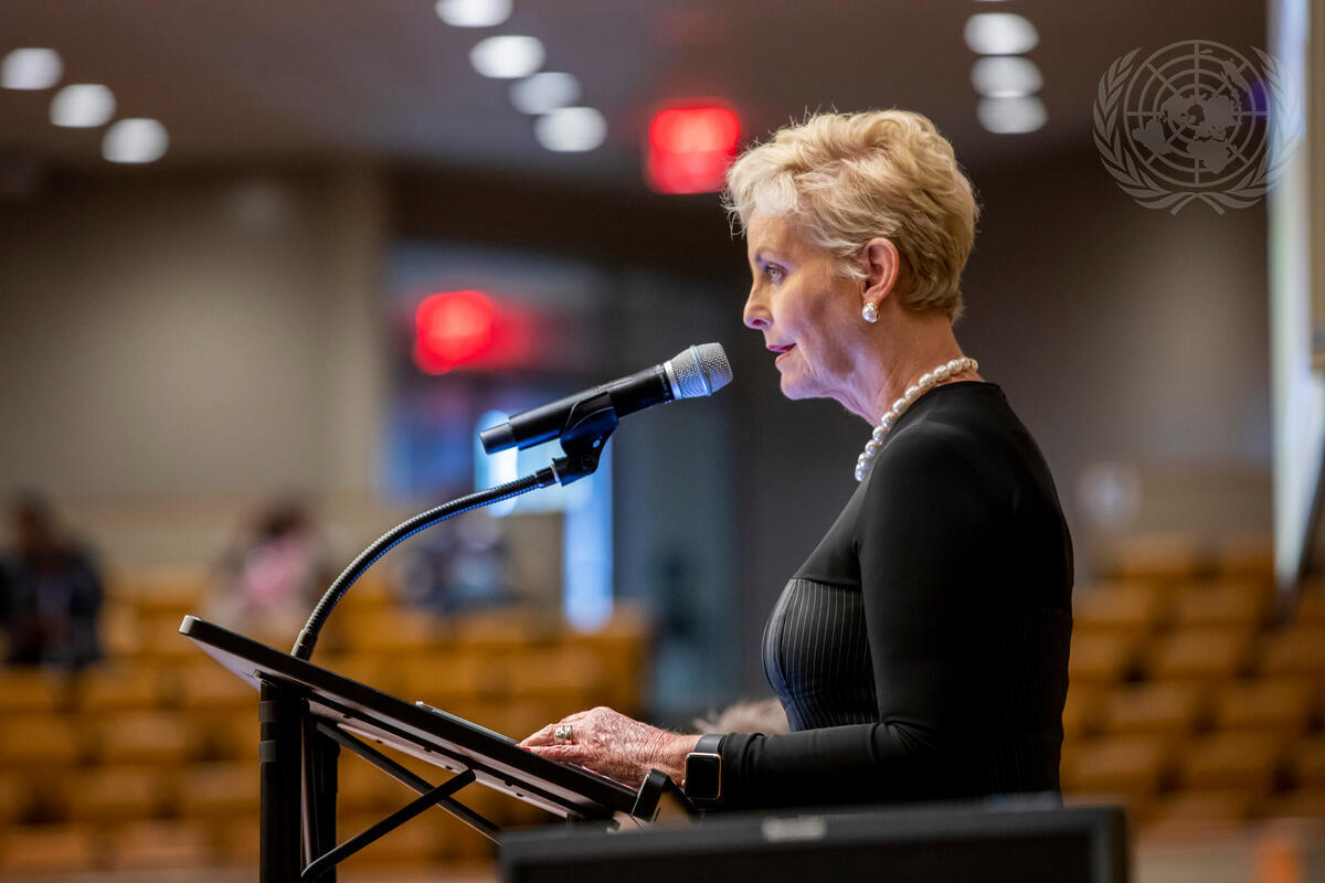 Cindy McCain, businesswoman, philanthropist, humanitarian, and widow of late U.S. Senator John McCain, addresses an event entitled ""Stepping up Action to End Forced Labour, Modern Slavery and Human Trafficking"".
