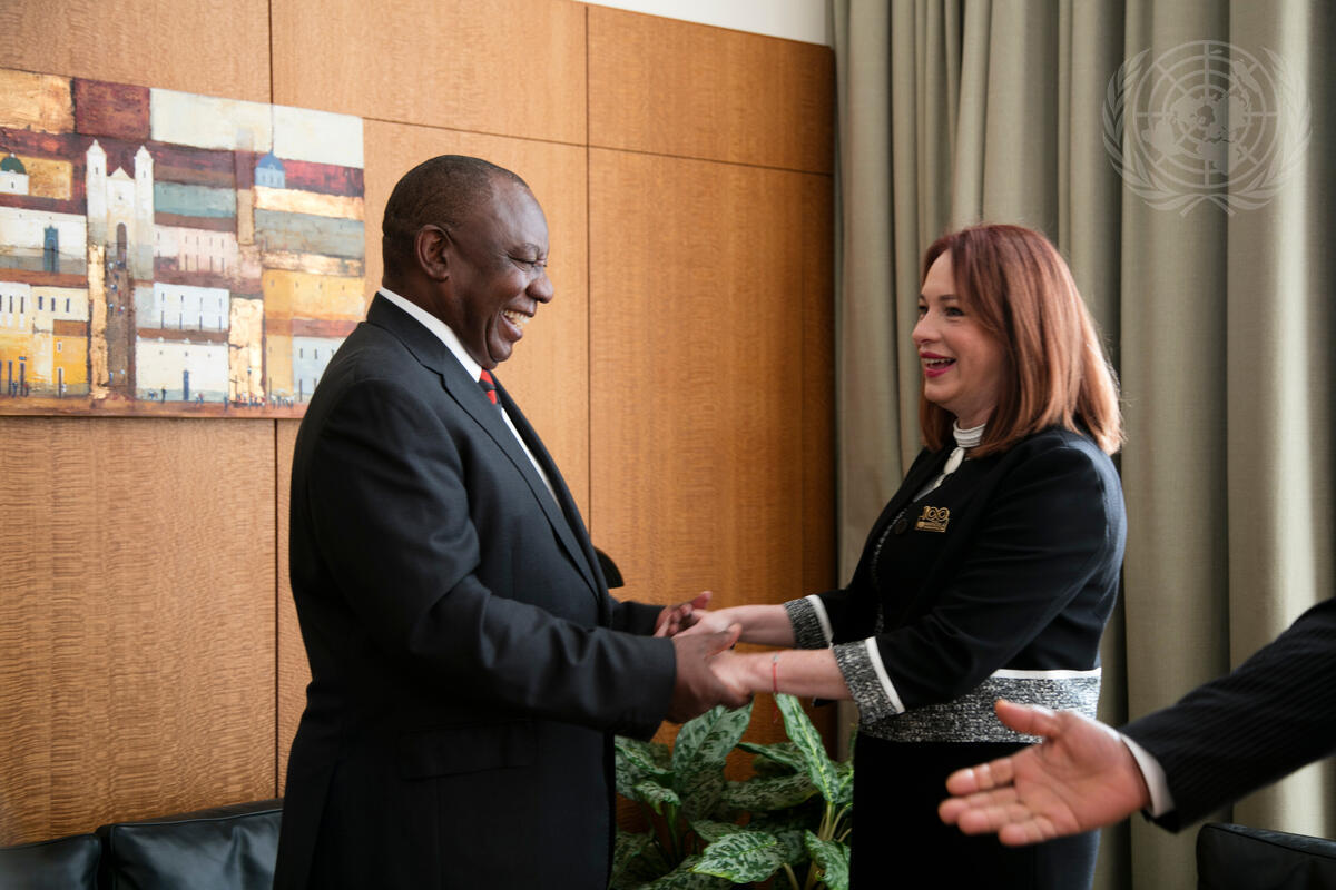María Fernanda Espinosa Garcés (right), President of the seventy-third session of the General Assembly, greets Matamela Cyril Ramaphosa, President of the Republic of South Africa.