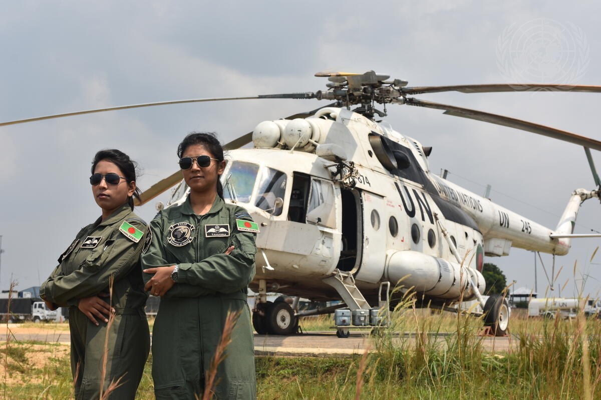 In 2017, Bangladesh, long one of the largest contributors to United Nations Peacekeeping, deployed women pilots for the first time when they sent Flight Lieutenants Nayma Haque and Tamanna-E-Lutfi to serve with the UN Organization Stabilization Mission in the Democratic Republic of the Congo (MONUSCO). Here, the two officers stand proudly in front of their helicopter.