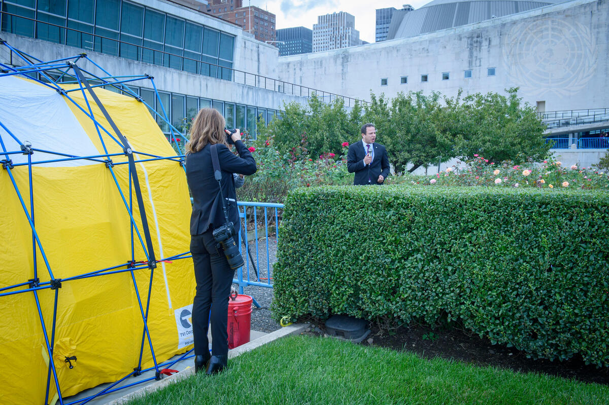 A UN photographer grabs a shot of a television journalist broadcasting from the rose garden of UNHQ on the first day of the 2018 high-level week.