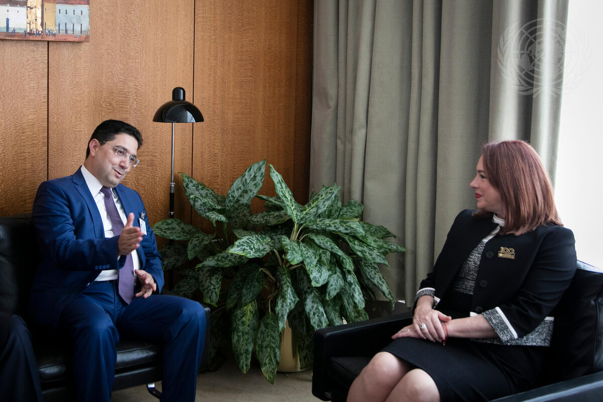 María Fernanda Espinosa Garcés (right), President of the seventy-third session of the General Assembly, meets with Nasser Bourita, Minister for Foreign Affairs and International Cooperation of the Kingdom of Morocco.