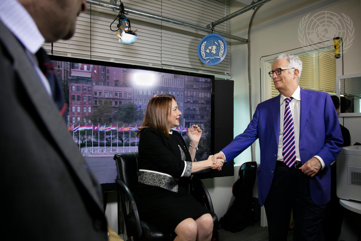 María Fernanda Espinosa Garcés (left), President of the seventy-third session of the General Assembly, greets Richard Roth, UN Bureau Chief of CNN, before her interview with CNN en Español.