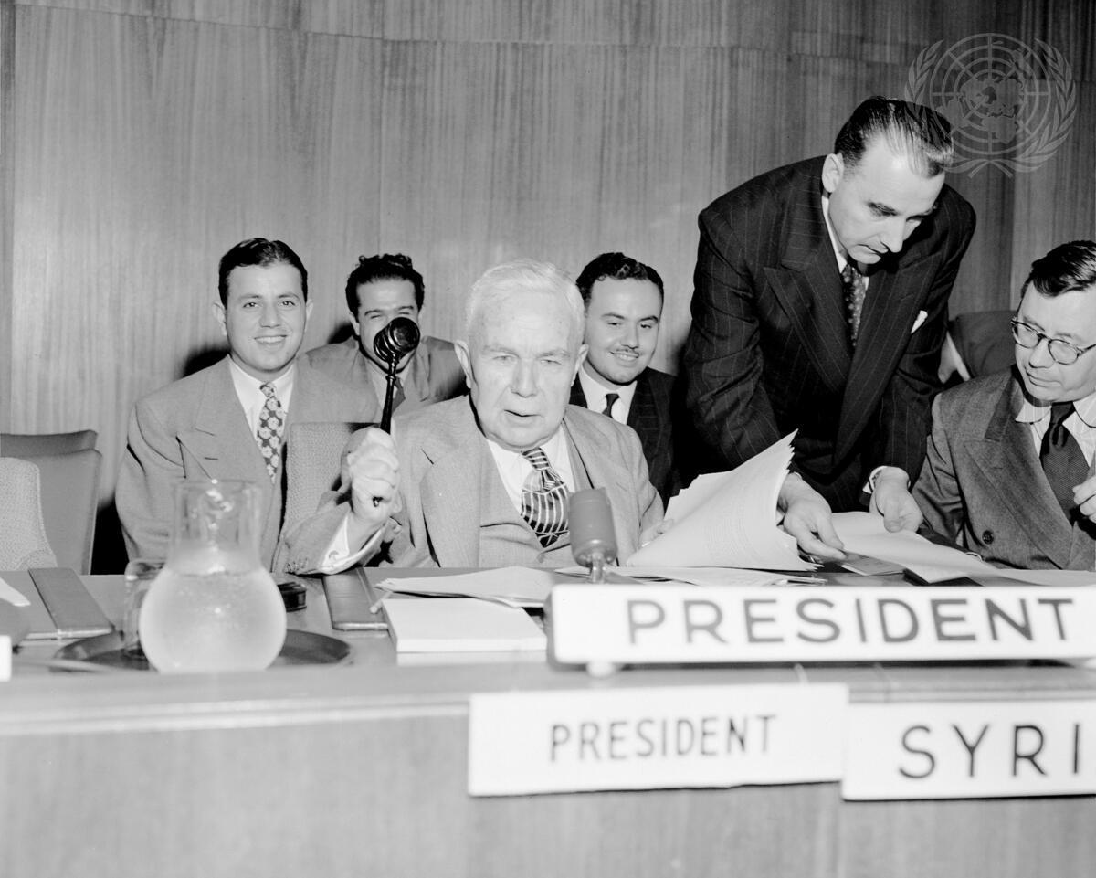 Faris el-Khouri, Syria, President of the United Nations Security Council for the month of June, raps his gavel, as he assumes the chair in accordance with the system of monthly rotation in alphabetical order. Assistant Secretary-General for Security Council Affairs Arkady A. Sobolev, right, and his Executive Officer, Dr. Dragoslav Protitch, standing, are also in the picture. The President reads messages from the States of the Arab League and the Provisional Government of Israel accepting the Security Council's call to cease fire in Palestine for a period of four weeks.