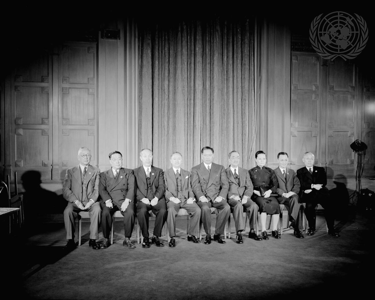 T.V. Soong, Minister for Foreign Affairs of China (centre), Acting President of the Executive Yuan and Chairman of the Chinese delegation, with delegation members. From left to right are: Shi Zhaoji, Hu Lin, Tung Pi-wu, V.K.W.Koo, T.V. Soong, Wang Chuhg-Hui, Wu Yi-Fang, Li Hwang, and Chamg Carson. [exact date unknown]