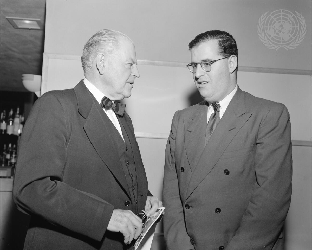 Warren R. Austin, Permanent Representative of the United States to the United Nations (left), in conversation with Israeli representative, Major Aubrey Eban, before a Security Council meeting on the Palestine question. [no exact date]