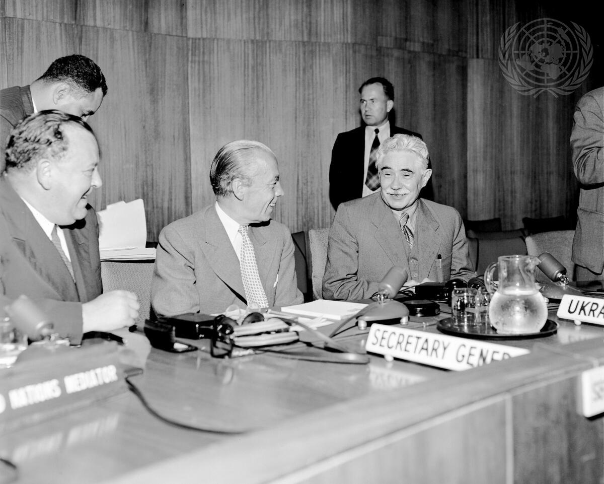 Caption Description Seated at the Council table from left to right are: Trygve Lie, Secretary-General of the United Nations; Count Folke Bernadotte, United Nations Palestine Mediator; and Dmitry Z. Manuilsky (Ukrainian Soviet Socialist Republic), President of the Security Council.