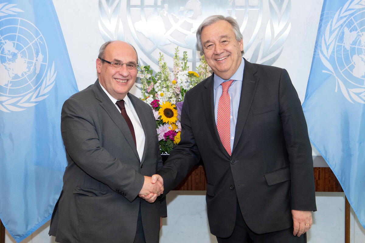 Secretary-General António Guterres (right) meets with António Vitorino, incoming Director General of the International Organization for Migration (IOM).