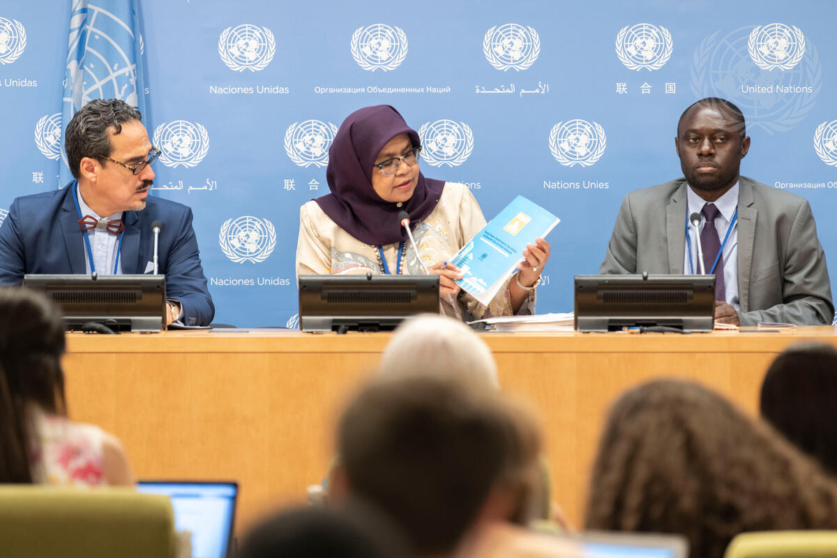 Maimunah Mohd Sharif (centre), Executive Director of the United Nations Human Settlements Programme (UN–Habitat), briefs press on the implementation of the Sustainable Development Goal 11, in the context of the High-level Political Forum on Sustainable Development (HLPF 2018), as a guest at the Noon Briefing.