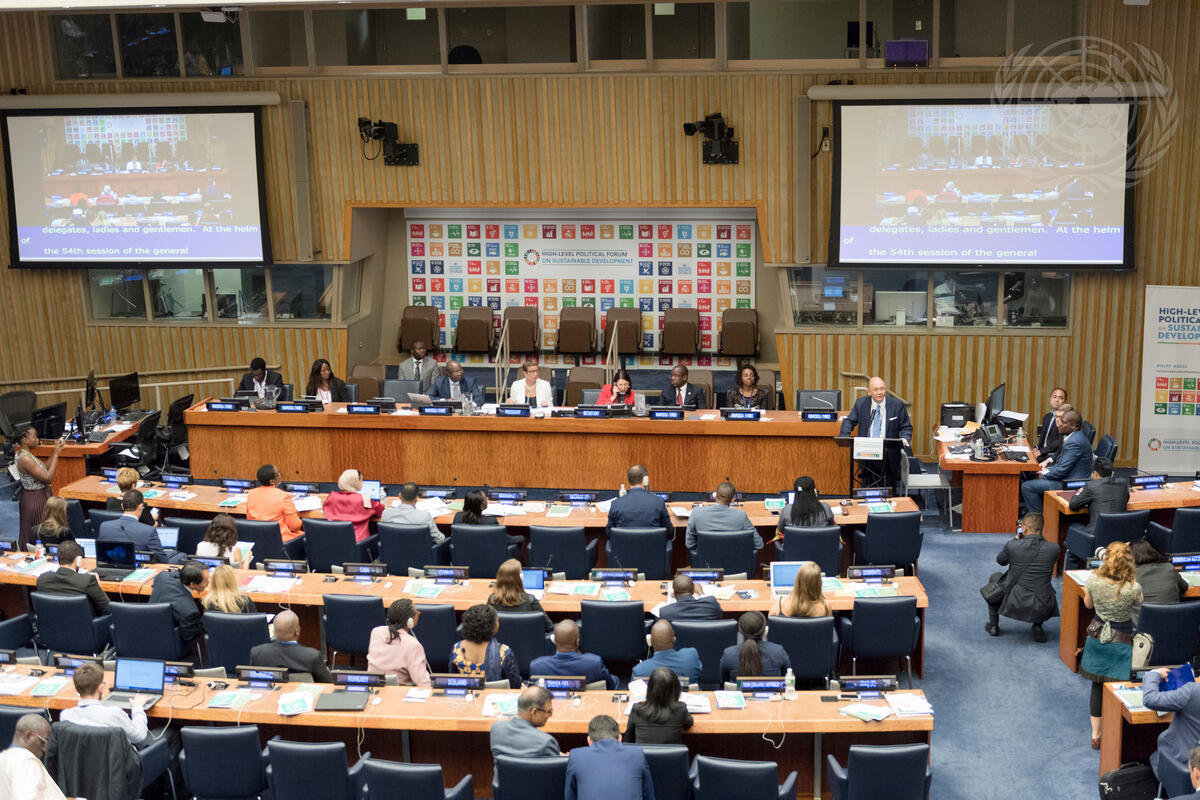 Wide view of the room as Neville Melvin Gertze, Permanent Representative of the Republic of Namibia to the UN, addresses the High-Level Political Forum on Sustainable Development meeting on voluntary national reviews.