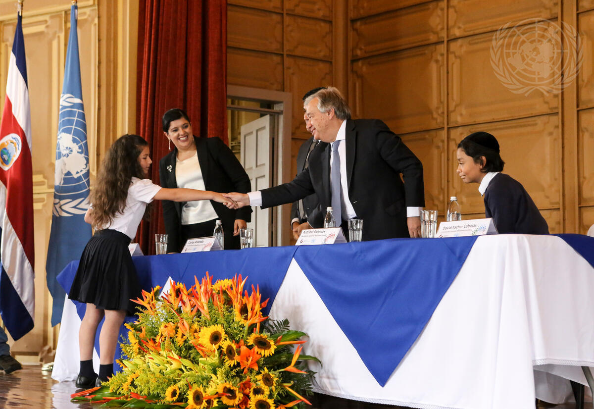Secretary-General António Guterres (standing, right) greets a student while visiting the Buenaventura Corrales School in San Jose, Costa Rica.