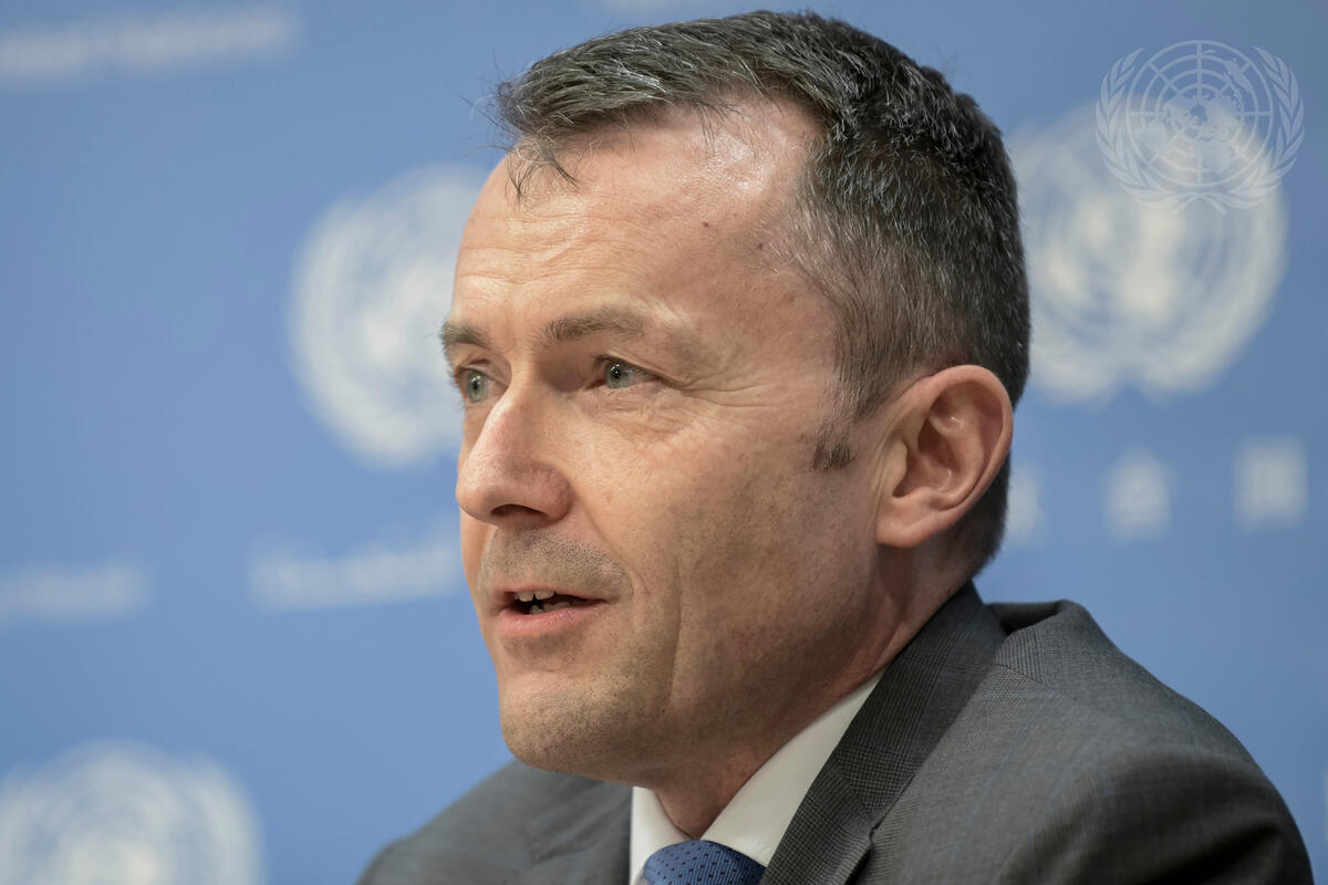 Jürg Lauber, Co-facilitator for the Global Compact on Migration process and Permanent Representative of Switzerland to the UN, briefs press on the finalization of the Intergovernmental negotiations of the Global Compact for Safe, Orderly and Regular Migration document that will be formally adopted in Marrakech, Morocco, in December.