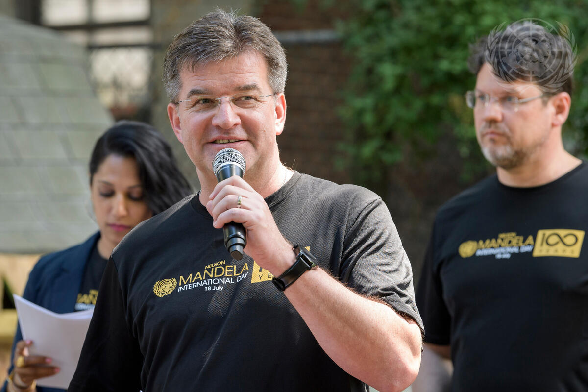 Miroslav Lajcák, President of the seventy-second session of the General Assembly, speaks at a volunteer event organized in honour of Nelson Mandela International Day. The 2018 observance marks 100 years since Mandela's birth (18 July 1918). Behind him are Penny Abeywardena (left), Commissioner of the City of New York; and Andries Carl Nel, Deputy Minister for Cooperative Governance and Traditional Affairs of South Africa.