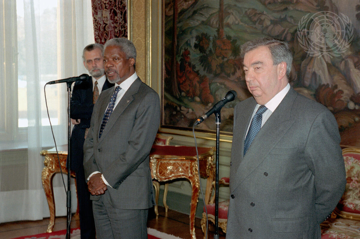 Kofi Annan, Secretary-General of the United Nations (left), and Yevgeny M. Primakov, Minister for Foreign Affairs of the Russian Federation (right), speaking to correspondents at a joint press conference.