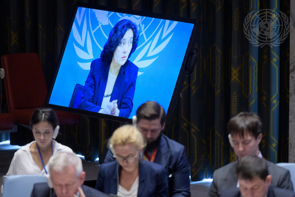 Leila Zerrougui (on screen), Special Representative and Head of the United Nations Stabilization Mission in the Democratic Republic of the Congo (MONUSCO), participates in the Security Council meeting on the situation in the Democratic Republic of the Congo.