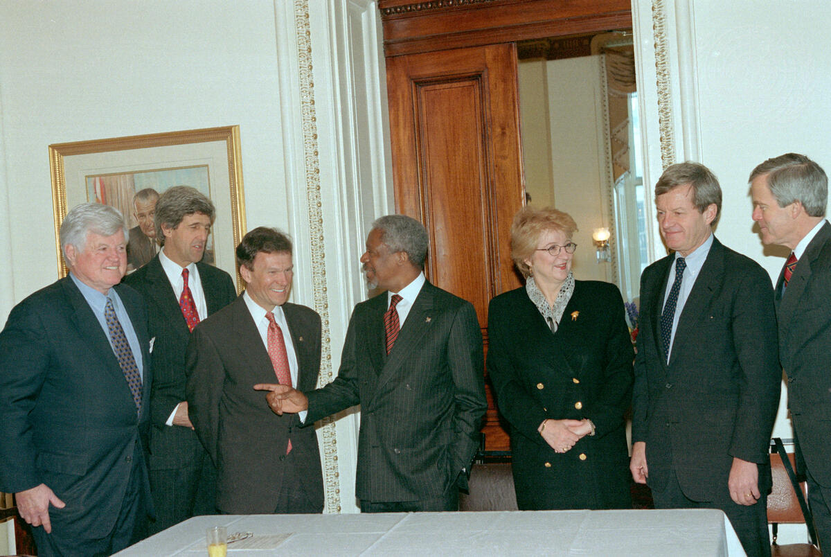 Photo shows the Secretary-General and Louise Fréchette, Deputy Secretary-General, meet with members of the Senate Democratic Caucus.