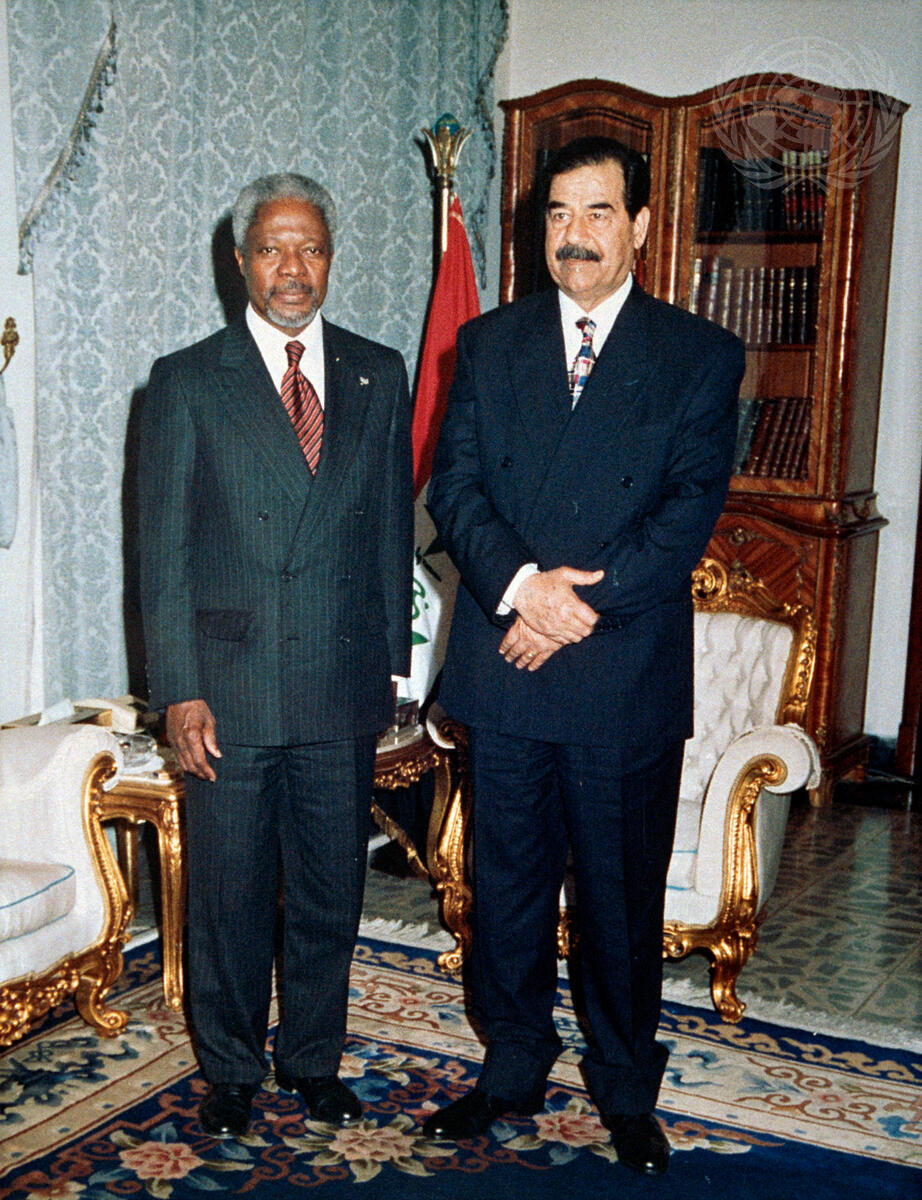 Secretary-General Kofi Annan (left) meets with President Saddam Hussein of Iraq at the Republican Palace.