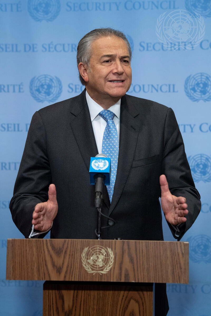 Caption Description Óscar Adolfo Naranjo Trujillo, Vice President of Colombia, addresses journalists prior to the Security Council meeting on the situation in his country.