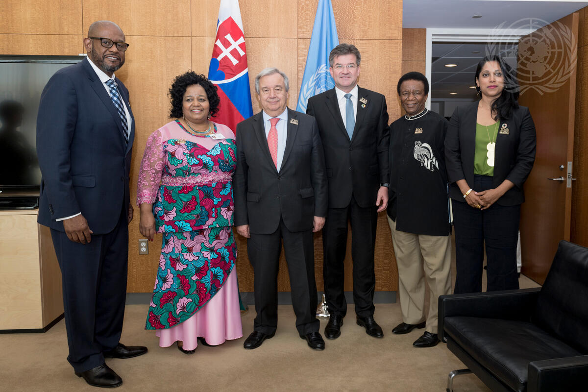 Secretary-General António Guterres (centre left) and Miroslav Lajcák (centre right) are joined by (left to right): Forest Whitaker, UNESCO Special Envoy for Peace and Reconciliation and SDG Global Advocate; Edna Molewa, Minister of Environmental Affairs of South Africa; Jerry Matthews Matjila, Permanent Representative of the Republic of South Africa; and Penny Abeywardena, Commissioner of the City of New York.