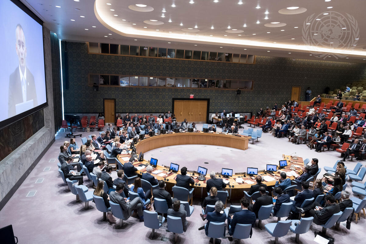 Wide view of the Security Council as Nickolay Mladenov (on screen), UN Special Coordinator for the Middle East Peace Process and Personal Representative of the Secretary-General to the Palestine Liberation Organization and the Palestinian Authority, briefs the Security Council meeting on the situation in the Middle East, including the Palestinian question.