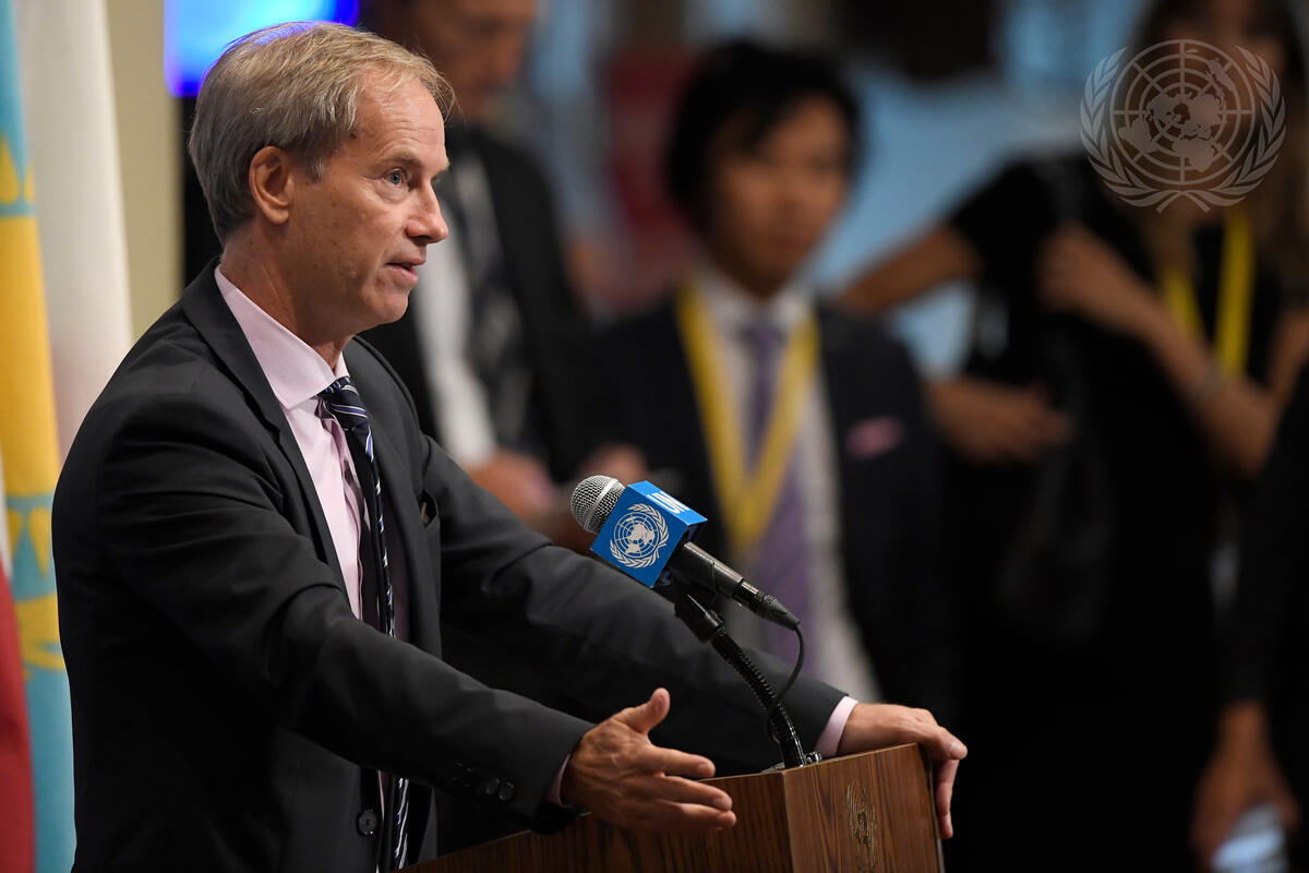Olof Skoog, Permanent Representative of Sweden to the United Nations and President of the Security Council for the month of July, briefs journalists.