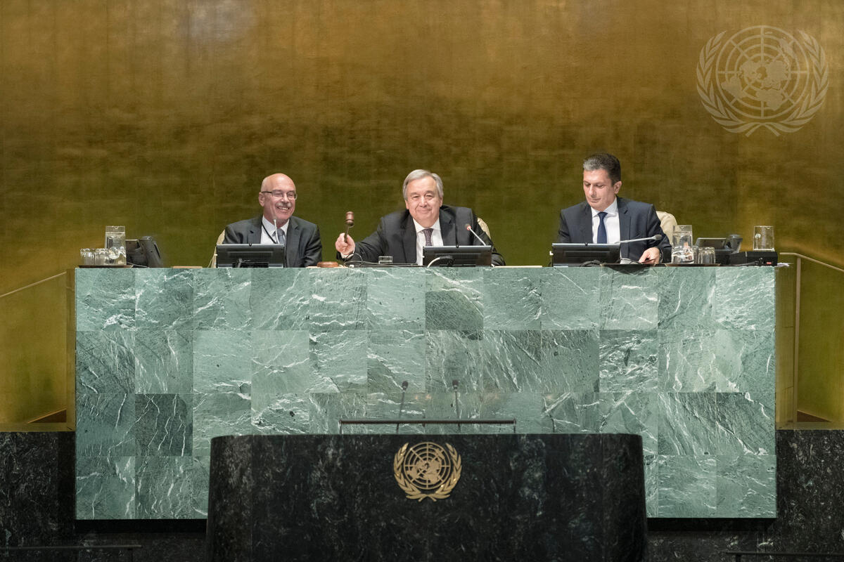 Secretary-General António Guterres (centre) chairs the closing of the High-level Conference of Counter-Terrorism. He is flanked by Vladimir Voronkov (left), Under-Secretary-General of the United Nations Office of Counter-Terrorism, and Movses Abelian, Assistant Secretary-General for General Assembly and Conference Management.