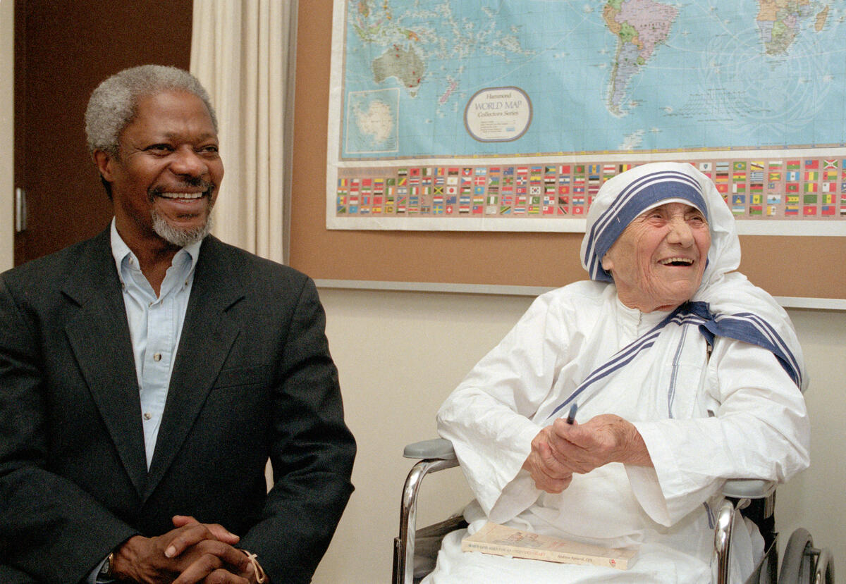 Kofi Annan, Secretary-General of the United Nations, with Mother Teresa, leader of the Order of the Missionaries of Charity, in the Bronx Borough of New York City.