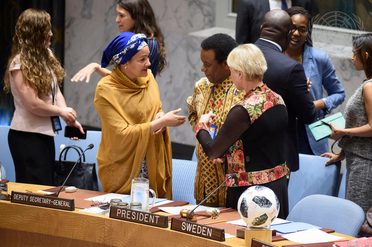 Deputy Secretary-General Amina Mohammed (left) speaks with Jerry Matthews Matjila (centre), Permanent Representative of South Africa to the UN, and Margot Wallström, Minister for Foreign Affairs of Sweden and President of the Security Council for the month of July, prior to the Security Council meeting on peace and security in Africa.