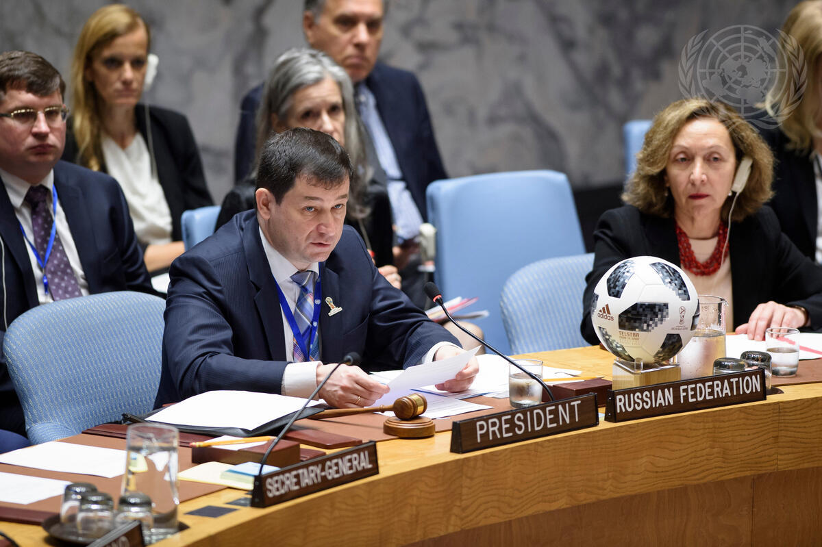 Dmitry Polyanskiy, First Deputy Permanent Representative of the Russian Federation to the United Nations and President of the Security Council for the month of June, chairs the Security Council meeting on the situation in the Sudan and South Sudan.