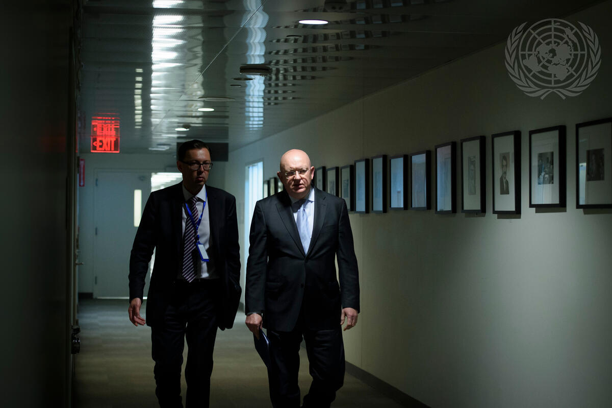 Vassily Nebenzia, Permanent Representative of the Russian Federation to the United Nations and President of the Security Council for the month of June, on his way to brief press on the Council’s work during the month of June.